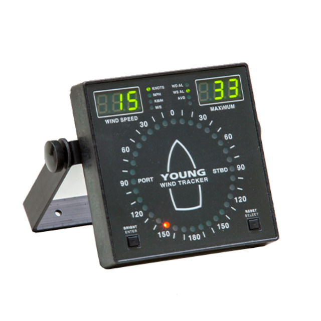 YOUNG 06206型風力跟蹤器是一款緊湊型風速和風向顯示器,具有相對風向和NMEA串行I/O等先進功能,適合船上使用。與大多數YOUNG風傳感器兼容(不包括電壓輸出型號),它將顯示瞬時風速和極大陣風值,可選擇mph, m/s, km/hr,或knots。風向清晰地顯示在LED的圓形圖案上。粗體前面板圖形可快速顯示相對于船舶航向的風向角。亮度控制允許調整,以便在任何光線下都能看到良好效果。即使在黑暗的駕駛室中,發光的前面板標記也能看到。電壓輸出(0-5 VDC)是標準特性。顯示器將直接使用12或24 VDC電源(12-30 VDC,3.5W)工作;包括雙電源(110VAC/230VAC)??梢詥⒂谩帮L跟蹤器”來顯示平均值。警報繼電器連接可用于風速和風向。右上顯示屏也可以設置為數字顯示相對于船首的相對風向,而不是極大陣風。單個傳感器可以使用多個顯示器。海上風跟蹤器非常緊湊,便于安裝在垂直艙壁或控制臺上。