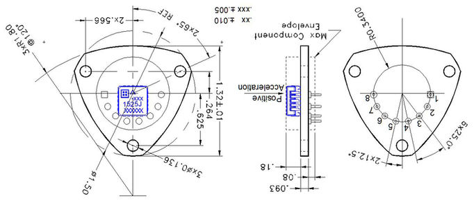型號2225的輸入軸垂直于PCB。地震中心位于LCC加速計內PCB的中心,位于PCB頂部上方約0.110英寸(2.75 mm)處,PCB頂部是2225的參考表面。