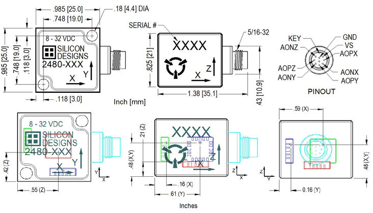 對于所有型號:在沒有特別指定的情況下,默認(rèn)的供電電壓(Vs)為+8至+32伏直流電,測試條件下的溫度(TC)設(shè)定為25攝氏度,并且處于差分模式。加速度測量范圍(量程)為±g,對應(yīng)的輸出電壓范圍是8000毫伏。