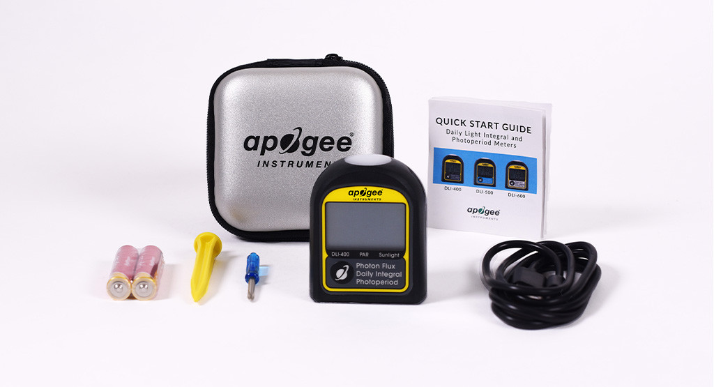 堅(jiān)固耐用且隨時(shí)可用:DLI-400 堅(jiān)固耐用,防護(hù) 等級(jí)為 IP65,可承受惡劣和潮濕的環(huán)境,可以隨身攜帶進(jìn)行抽查,直接放置在任何水平表面上,或通過(guò)連接到常用的相機(jī)三腳架、夾具或使用底部的標(biāo)準(zhǔn) ?-20 螺紋端口進(jìn)行樁子。DLI 儀表由鑄造丙烯酸擴(kuò)散器(過(guò)濾器)、光學(xué)過(guò)濾器、光電二極管、信號(hào)處理電路和安裝在 ASA 塑料外殼中的 LCD 顯示屏組成。每個(gè) DLI 包裝都包括儀表、一個(gè)保護(hù)性手提箱、兩節(jié) AAA 電池、一個(gè)快速入門(mén)說(shuō)明指南、一把螺絲刀、一個(gè)便于安裝的土壤釘和一根 USB-C 電纜,用于將儀表存儲(chǔ)的數(shù)據(jù)作為 CSV 文件下載到計(jì)算機(jī)。