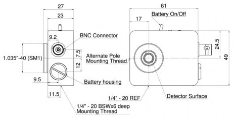 FPS-1是一種快速光學探頭,用于可視化及測量光譜范圍為193 nm至1100 nm的激光束的時間特性。它內含紫外增強硅PIN光電二極管,設計用于將光信號轉換為電信號,然后利用第三方測量儀器(如示波器或用于測量的頻譜分析儀)來測量電信號。FPS-1的上升時間為1.5 nsec。由內置電池或外部直流電源(包括在內)來提供反向偏置電壓。