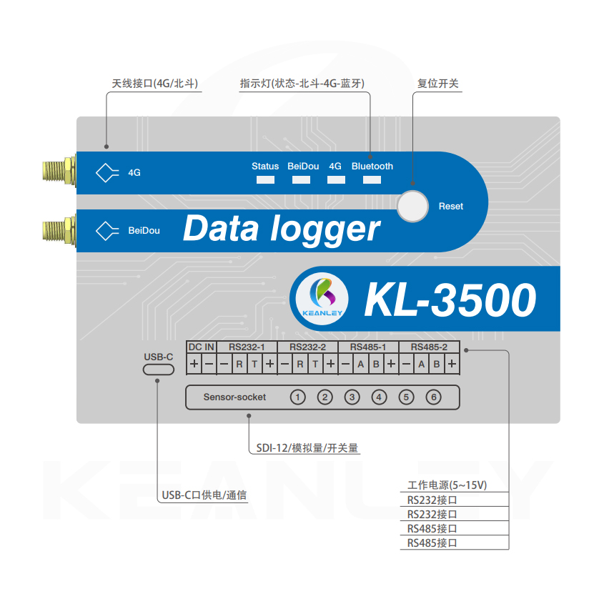 KL-3500專門用于SDI協議和DDI模式,RS485和RS232以及模擬量和脈沖量的傳感器。數據記錄儀有12個插接口(6個傳感器接口,2個帶供電的485,2個帶供電的232,1個大氣壓溫度接口,一個北斗數據口)具體參考軟件界面里的接口說明,一個2P的3.81端子供電口,2個TYPE-C接口(都可以供電和通信)1個復位按鈕,4個狀態指示燈,D9為運行狀態指示燈,D10為北斗狀態指示燈,D11為4G狀態指示燈,D12為藍牙狀態指示燈,2個天線接口,一個為4G通信天線,一個為GPS天線,底部是電池倉可使用8節鎳氫電池或堿性電池。
