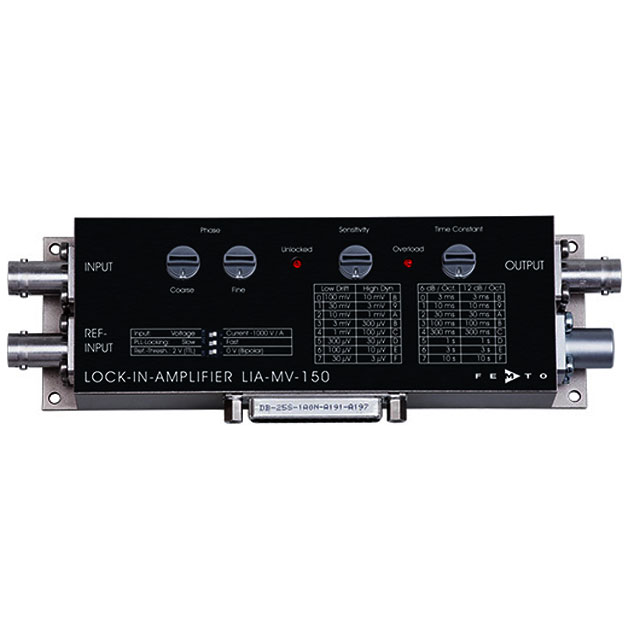 兩種編程方式放大器設置 - 例如相位、增益、時間常數 - 由放大器模塊上的開關直接控制或使用標準數字 I/O 計算機板從外部控制。可變工作頻率由外部參考信號確定,該外部參考信號可以是例如斬波輪的同步信號或激光器的調制信號。電流輸入非常適合放大來自高阻抗源(如光電二極管或 PMT)的信號,而電壓輸入可用于測量來自低阻抗源(如熱電阻或線圈)的信號。