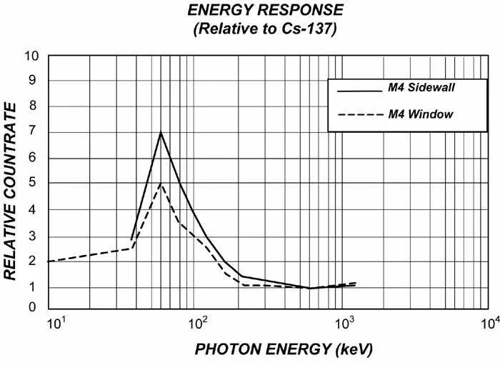 1000 CPM/mR/小時 (Cs137) 檢測低至 2.5 MeV 的 alpha;3.6 MeV 下的典型檢測效率大于 80%。檢測 50 keV 的 β,典型檢測效率為 35%;檢測 150 keV 的 β,典型檢測效率為 75%。通過窗口檢測典型低至 10 keV 的伽馬射線和 X 射線,通過外殼檢測最低 40 keV 的伽馬射線和 X 射線。