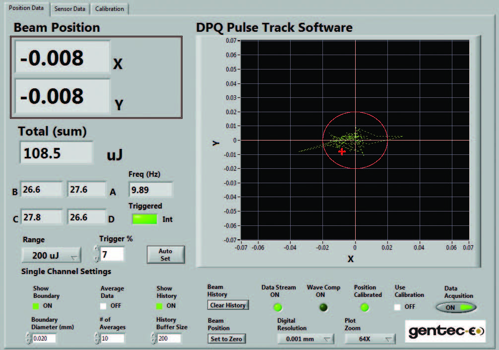 QUAD-4Track 包含功能強大的單機軟件 LabView,用于控制儀表、處理數據并顯示 X 軸和 Y 軸位置。該軟件還可顯示脈沖源的能量或功率以及重復率。本界面中的大型圖表顯示線束的矩心位置并實時追蹤其移動。該關鍵包含許多實用功能,例如:設置邊界、放大(2 倍至 128 倍)、設置分辨率、數據記錄等,不一而足。綠線代表追蹤歷史。