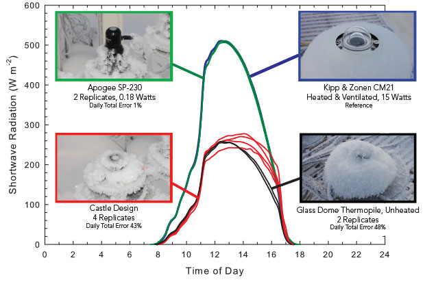 猶他州洛根 1 月霜凍后的太陽輻射,直到上午 11 點都是陰天 兩個復制的 Apogee SP-230 日射強度計與加熱和通風的參考日射強度計幾乎相同。盡管上午 11 點后陽光明媚,但兩個未加熱的玻璃圓頂熱電堆和四個復制的未加熱城堡設計日射強度計上的霜直到下午 4 點(1600 小時)后才融化。