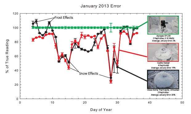 Logan UT 中三組日射強度計的霜雪積聚效應,以真實讀數的百分比表示。Castle 設計和未加熱的熱電堆傳感器一個月的平均誤差為 20%,最大誤差為 80%。圖 1 的數據來自第 12 天。