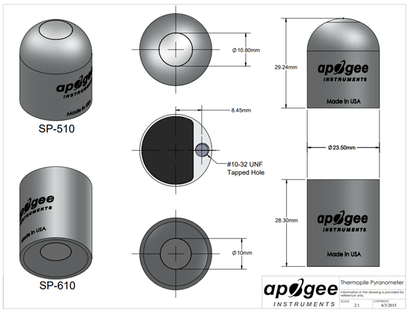 Apogee Instruments SP-510 和 SP-610 日射強度計由安裝在陽極氧化鋁外殼中的熱電堆探測器、丙烯酸擴散器 (SP-510) 或玻璃窗 (SP-610)、加熱器和信號處理電路組成。要安裝到桅桿或直接安裝到太陽能電池板,我們建議使用 AL-130 反照率計安裝支架或AM-500凈輻射計安裝支架,搭配帶 12" 桿的AM-130安裝夾具。