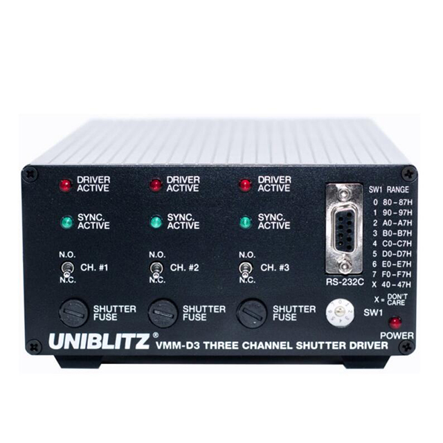 Uniblitz VMM-D3 是一款三通道快門驅(qū)動器,能夠獨立控制最多三個快門。這種緊湊的設(shè)計將三個完整的獨立快門驅(qū)動器放在一個精簡的封裝中。有源高電平邏輯輸入允許完全獨立的快門控制。單個輸入將同時激活所有通道,并且單個輸出可用于監(jiān)控所有快門同步系統(tǒng)電路何時處于活動狀態(tài)。三個有源低電平邏輯輸出監(jiān)控每個同步系統(tǒng)輸出的狀態(tài)。還提供可尋址的 RS232-C 串行輸入,可通過計算機串行端口控制這些輸入,從而允許從單個計算機串行端口控制最多八個 VMM-D3 單元和最多 24 個獨立快門。
