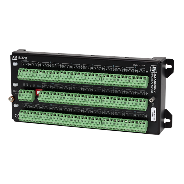 The AM16/32B multiplexer significantly increases the number of sensors that you can measure with a Campbell Scientific data logger. It interfaces with the data logger and adds terminals so that you can wire additional sensors of almost any type.