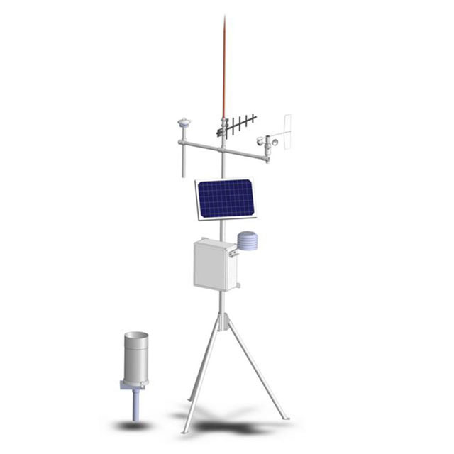 The General Purpose Weather Station includes high quality meteorological sensors, all required signal cables and mounting hardware, an expandable tripod, and a data acquisition system or signal translator. The system can be powered by AC or DC power, or by an optional solar power system.