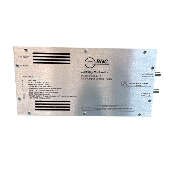 The PVM-4210 pulse generator module provides two pulse output channels, controlled by a common control logic. When the control logic receives a gate signal, both channels pulse simultaneously. One channel pulses from ground to the positive high voltage, and the other channel pulses from ground to the negative high voltage. Therefore each output can be connected to the electrodes of a Pockels Cell or Q-Switch, or to a pair of deflection plates, providing a 1,900 V differential pulse across the cell or plates.