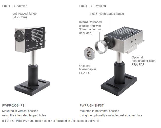 COMPATIBILITY WITH OPTICAL BENCH (FREE SPACE) AND FIBER OPTICSThe PWPR-2K photoreceivers are factory equipped with an optical free-space input. There is the choice between a 1.035″-40 threaded flange (FST) and a 25 mm unthreaded flange (FS). Both types offer a broad compatibility with optical standard accessories like tubes, lenses, cage systems and optical adapters from various manufacturers. The threaded free-space input (FST) e.g. can be easily converted to an optical fiber input by screwing the optionally available fiber adapters (PRA-FC and PRA-FSMA) on it.