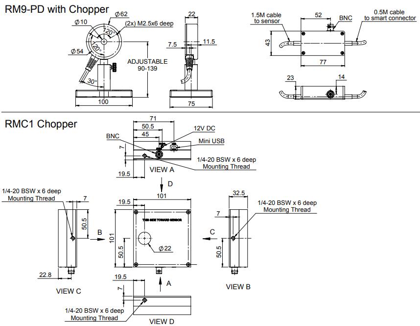 The RM9-PD radiometer system is a sensor and optical chopper system used to measure the power of very low level CW or quasi CW sources. The RM9-PD sensor has a photodiode element. The power range of the sensor is from 300fW (flying watt) to 300nW (nanowatt). It has a 10mm aperture and covers the spectral range from 0.2 μ m to 1.1 μ m. The system has an RMC1 chopper placed between the source and the RM9-PD sensor. (When installing the chopper, the side marked "THIS SIDE TOWARD SENSOR" should face the sensor.)