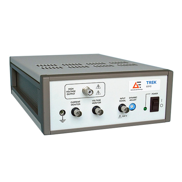 The Trek 601C high voltage amplifier provides precise control of output voltages and offers high slew rates, extensive bandwidth, and low-noise operation. It can feature up to two independent amplifier channels in one enclosure and is highly reliable thanks to its all-solid-state design. The Trek 601C’s four-quadrant, active output sinks or sources current into reactive or resistive loads making it an ideal choice when you need accurate output responses and high slew rates demanded by reactive loads. Applications such as drive piezoelectric actuators, modulate electro-optics, and electrostatically controlled ion beams are typical uses for the Trek 601C.